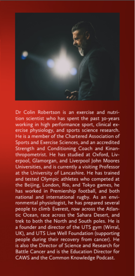 Dr. Colin Robertson ist Sport- und Ernährungswissenschaftler und arbeitet seit über 30 Jahren im Bereich des Hochleistungssports, der klinischen Trainingsphysiologie und der sportwissenschaftlichen Forschung. Er ist ein akkreditierter Strength and Conditioning Coach, Kinanthropometrist und registrierter Ernährungsberater bei der British Dietetics Association.